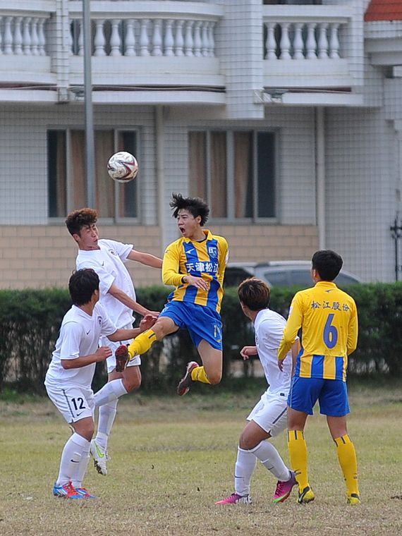 12月18日,天津松江隊和遼寧宏運隊隊員在比賽中爭搶頭球。 當天,2013年全國青少年男子足球錦標賽(U19組)在梧州國家足球訓練基地舉行,來自全國的12支隊伍將連續進行12天的比賽。記者 何鎏/攝