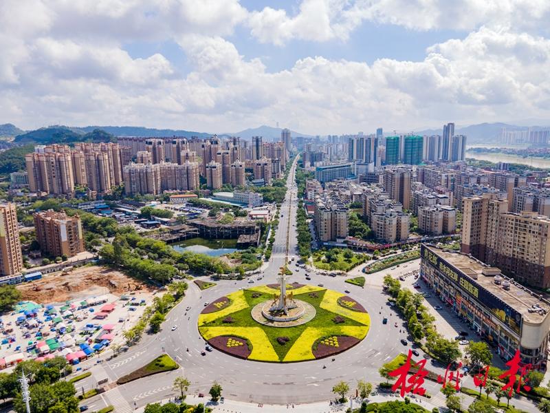 近日,在三龍大道轉盤,造型獨特的龍魚雕塑和精心布置的綠植相互映襯,車輛有序通行,周邊高樓林立,遠處的山巒與江水若隱若現,展現出梧州蓬勃發展的城市風貌與獨特的山水魅力(無人機照片)。