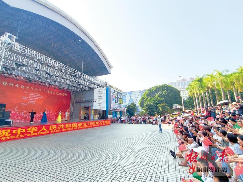 10月1日,2025年梧州市慶祝中華人民共和國成立76周年文藝演出暨新時代璀璨廣場群眾文化活動在市政廣場舉行,眾多市民前來觀看。梧州日報記者 李鴻榮 攝