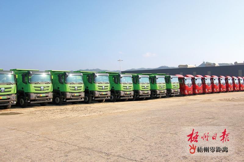 近日,在梧州市金海不銹鋼有限公司廠區內,19輛嶄新的新能源牽引車和新能源重型自卸貨車整齊列隊,正式投入使用。 金海不銹鋼供圖