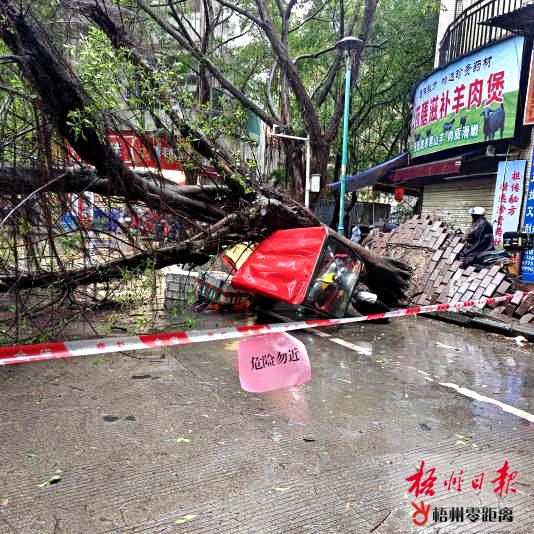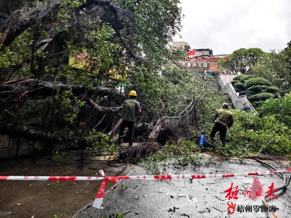 梧州零距離-梧州日?qǐng)?bào)訊 11月4日,受連日降雨影響,萬秀區(qū)富民街道棗沖社區(qū)轄區(qū)內(nèi)、紫荊花園小區(qū)附近的一棵大樹倒伏,橫亙?cè)诘缆分醒耄执蟮臉涓膳c散落的殘枝落葉阻斷交通,給周邊居民出行帶來極大安全隱患。